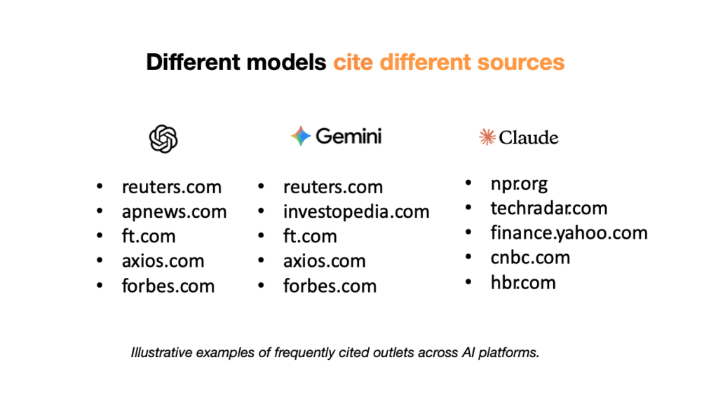 These systems draw heavily on earned media and other authoritative sources, but the mix of sources vary greatly by platform.