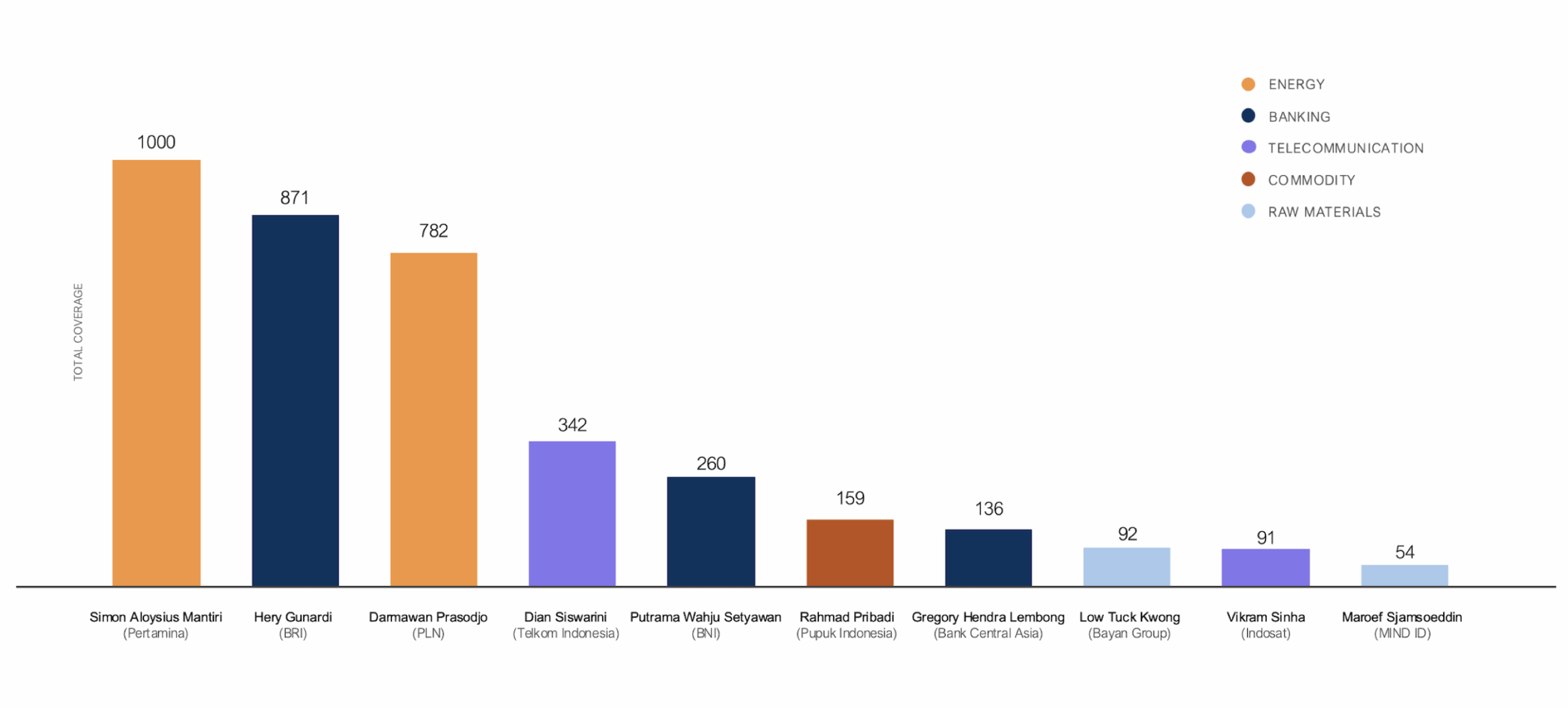 CEOs from the Energy, Banking, and Telecommunications sectors led in media coverage, which underscores the significance of their industries and ongoing transformations.