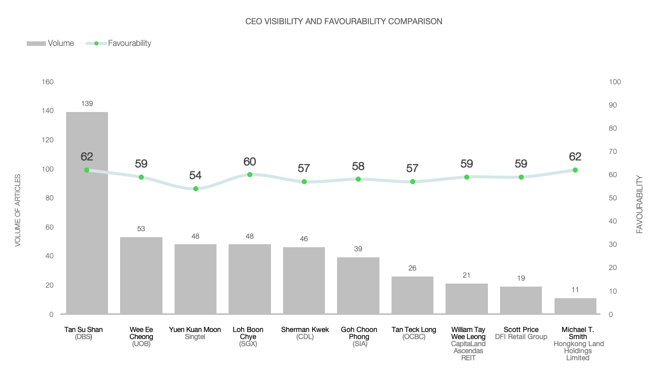 Media visibility does not always translate into positive perception. While DBS CEO Tan Su Shan generated the most coverage, Hongkong Land CEO Michael T. Smith achieved a similarly strong favourability profile with far fewer mentions, suggesting that tone and context often matter more than sheer volume of attention.