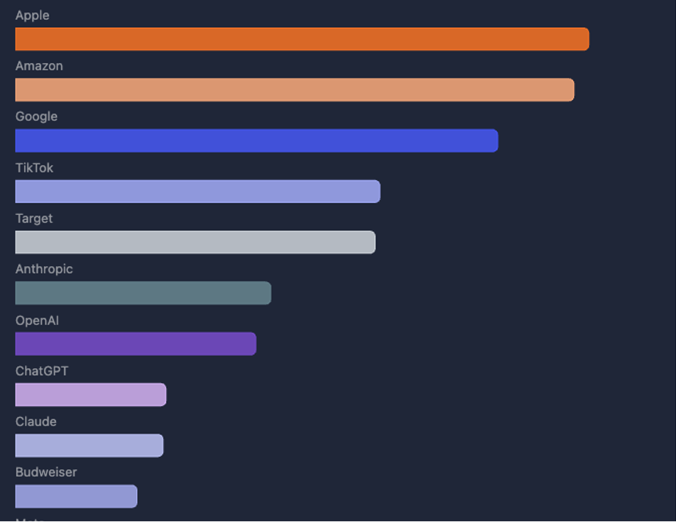 Beyond Google, CARMA’s Top 10 brands by volume reflected a clear thematic pattern. AI-focused organisations, including Anthropic and OpenAI, featured prominently in the overall conversation. However, high visibility did not consistently translate into high-ranking positions across the leading ad review lists.